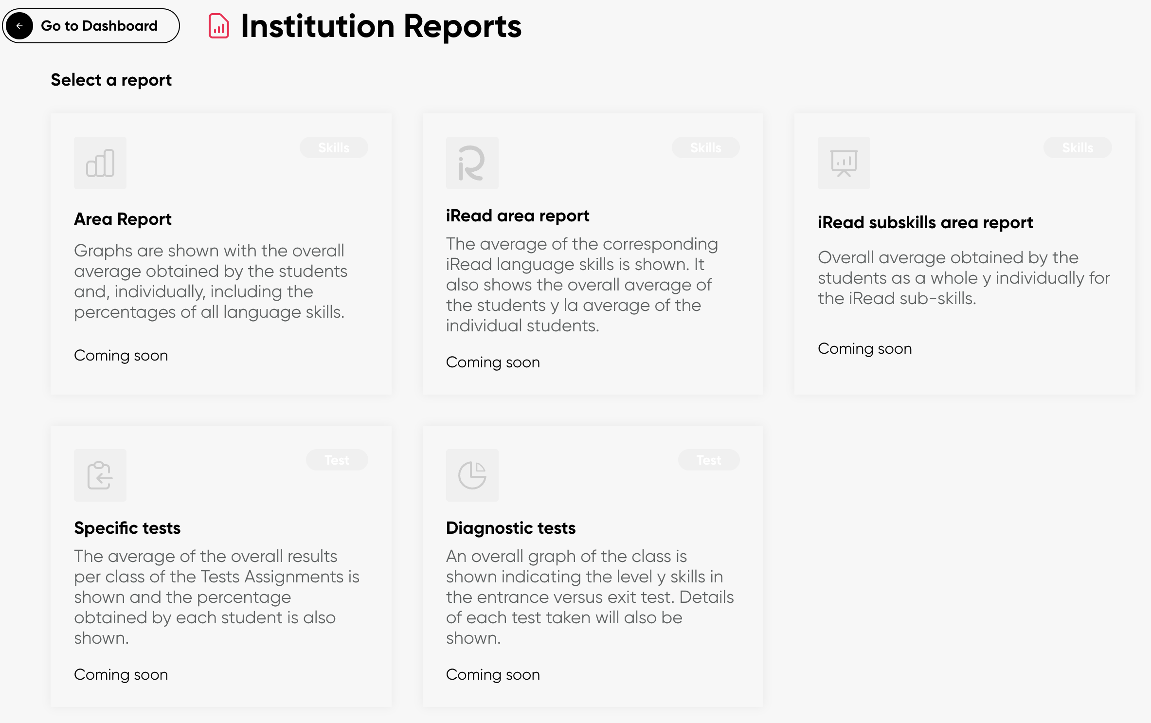Los Institution Reports son herramientas de gestión del progreso de los estudiantes a nivel institucional. Estos reportes solo están disponibles para Training Managers.
