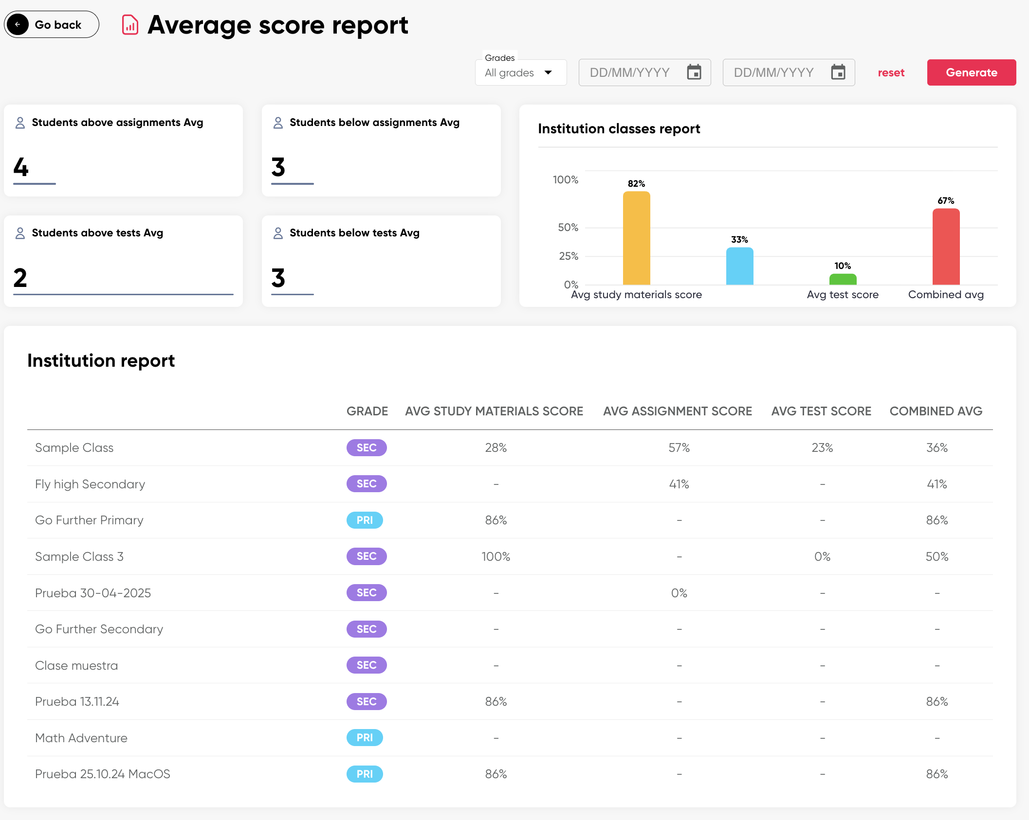 Average score report: Los gráficos se muestran con el promedio general obtenido por cada clase en las diferentes categorías disponibles.