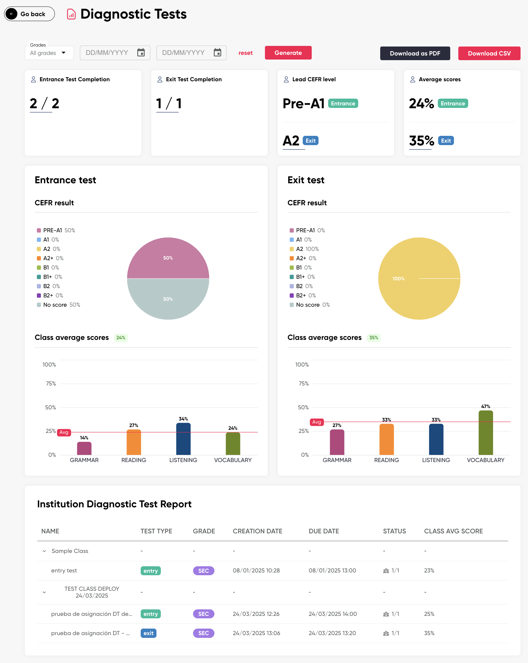 En la parte superior aparecen cuatro tarjetas que muestra el número de estudiantes que completaron las evaluaciones de entrada y salida del Diagnostico Test. Así mismo, se incluye un resumen del nivel CEFR obtenido y el promedio de puntaje en ambas evaluaciones (entrada / salida).
