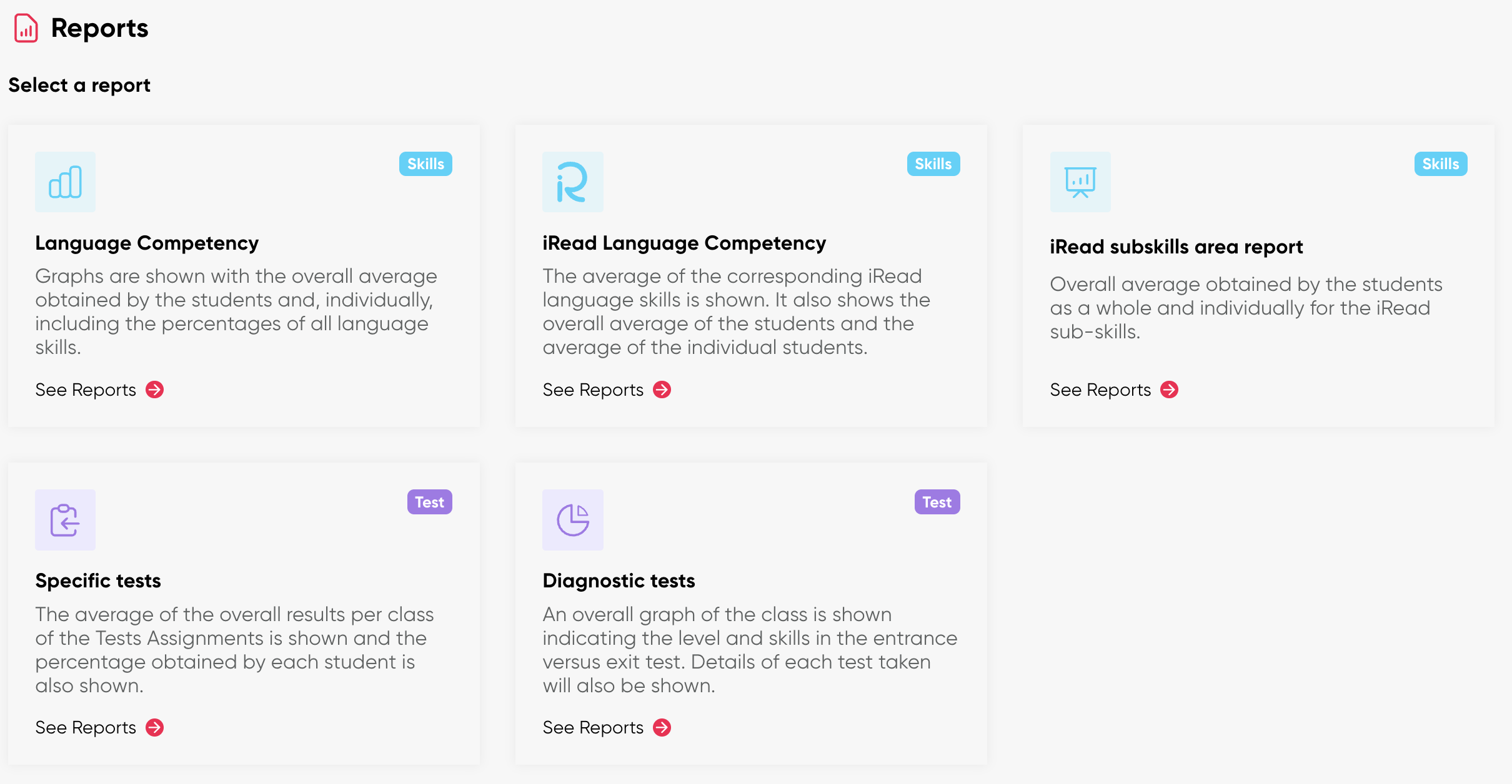 iRead Subskills Area Report: Shows the overall average obtained by students collectively and individually for the iRead subskills.