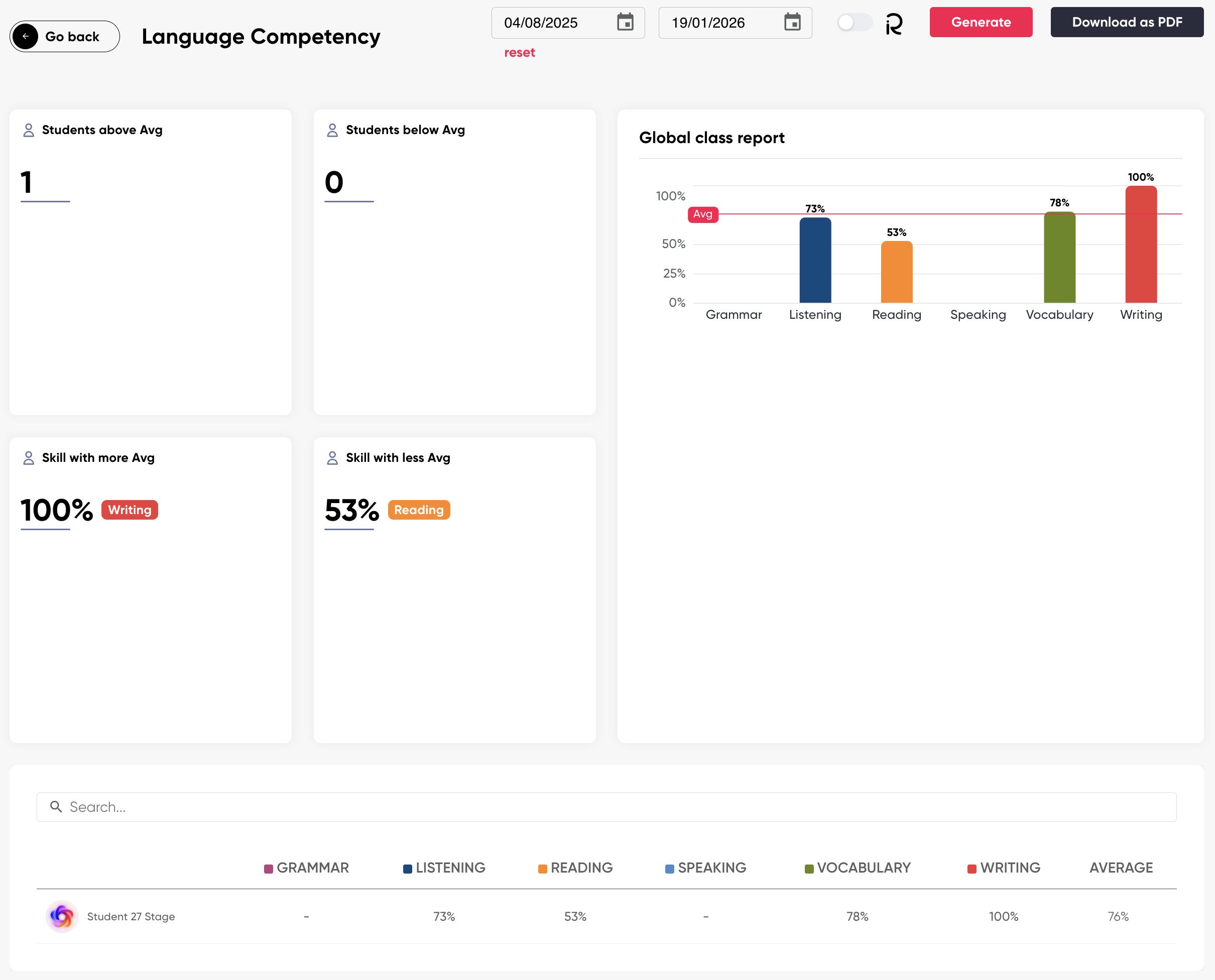 The Language Competency shows the percentage obtained for the Learning Objectives (LOs) assigned by the teacher and the activities completed through self-study, as well as a quick overview of the highest and lowest scoring skills across all students, and the total number of students performing above or below the class average.